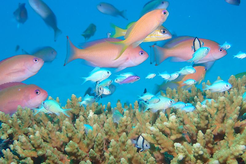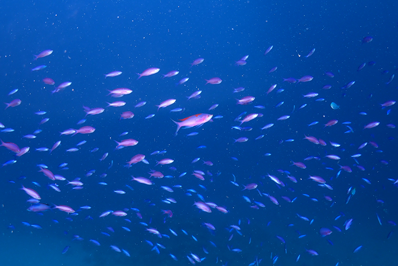 撮るのが難しい大仏サンゴの上にいるハナゴイの群れを、