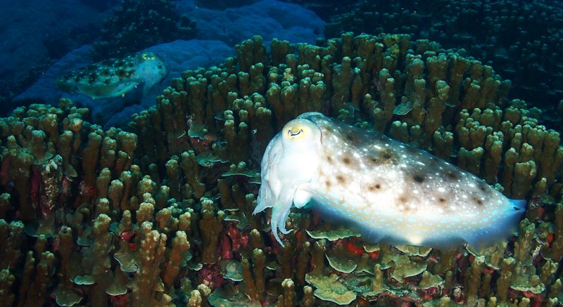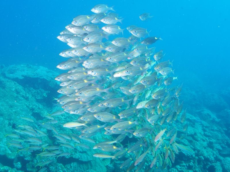 キャッツアイたちはノコギリダイ、アカヒメジの群れと