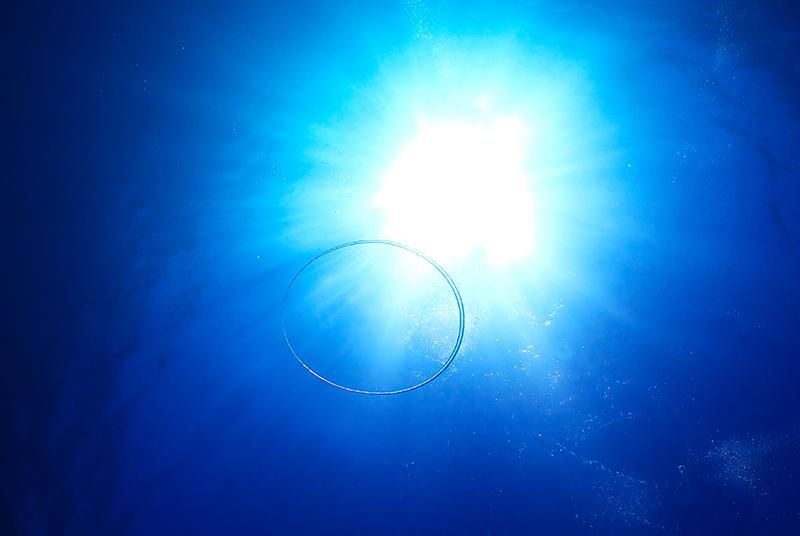 太陽がまぶしすぎるのでバブルリングを作って遊んでいたら、ボート上でガイド友達のかっきんが