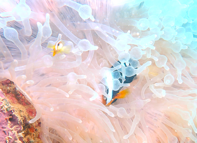 白化したイソギンチャクの中で元気の泳ぎ回ってるクマノミたち