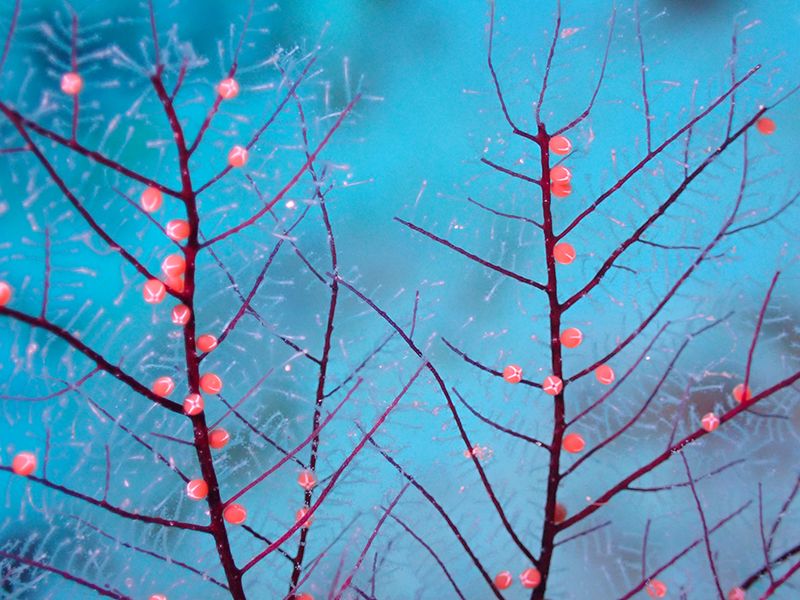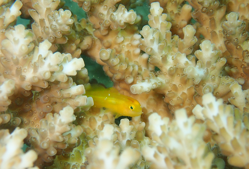 サンゴの隙間からキイロサンゴハゼ