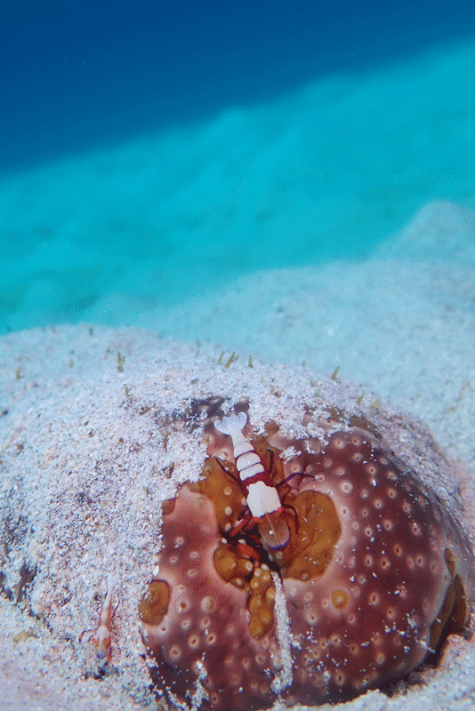 砂被りのナマコの上にウミウシカクレエビ発見!!