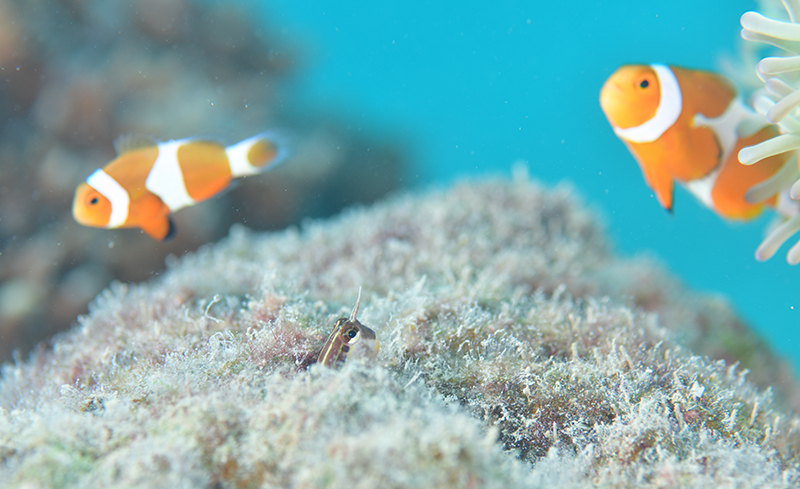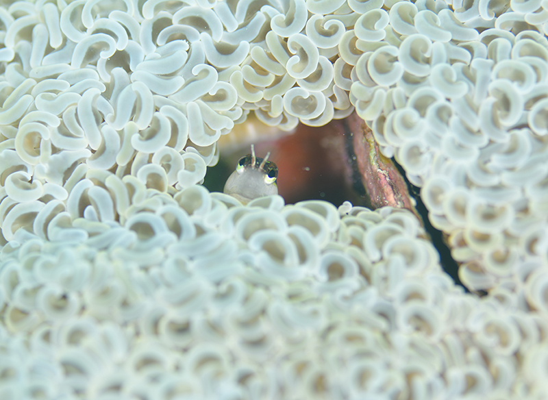 ぴょこんと顔を出してカクレクマノミを見つめる